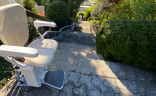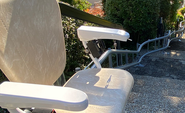 O apoio para os pés, os apoios para os braços e o assento da cadeira elevadora se dobram facilmente, para as escadas permanecerem livres.